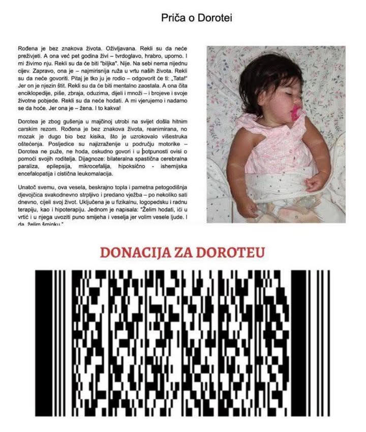 Dragi prijatelji i ljudi dobre volje. Oni ne hodaju,ne pričaju, ne mogu puzati, ali baš ti im možeš pomoći. Umjesto nekog malog gusta, napravi mali potez 1,2,3, 10,20 eura .Nebitno koliko, uplati koliko si u mogućnosti i omogućiti ćeš ovim anđelima terapije u Meksiku. Budi i ti kap u moru dobrote. Luki fali 3.000 , a Dorotei 7.000 eura. Ajmo to danas riješiti. Ukoliko netko uplati na nas prebaciti cemo. Hvala i na svakom dijeljenju. Čim se prikupiti iznos, javljam. Hvala u njihovo ime. ❤️❤️❤️❤️