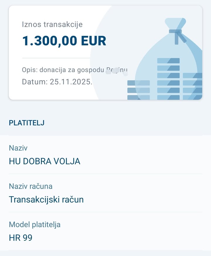 Naravno odmah je nazvala i plakala . Nikada nije ništa dobila, a pogotovo 1.300,00 eura od nepoznatih ljudi. Želim vam svima zahvaliti u njeno ime. Znam da će ona sada danima plakati zbog toga, ali znam da su to suze radosnice. 12 mjesec nam je rezerviran za Božić. Trenutno NE PRIMAMO nove korisnike. Odjeću i obuću također ne primamo. Sada nam je prioritet hrana (skladište je prazno), pokloni za dječicu i za korisnike centra sa autizmom njih cca 50 tak. Želimo našim obiteljima osigurati lijepi Božić.