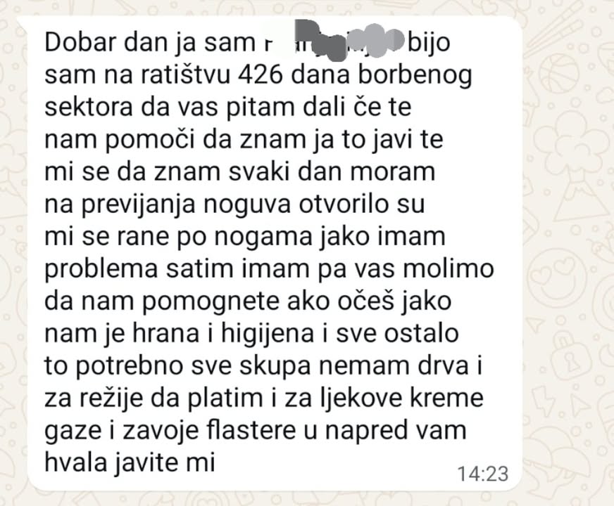 Kada smo u mogućnosti pomognemo branitelju koji živi od 170 eura. Treba platiti režije, drva, lijekove flastere....