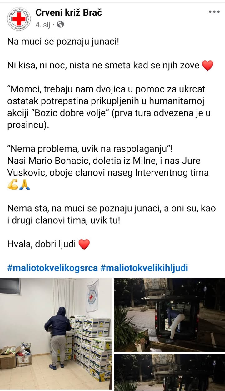 Veliko hvala CK Brač i okolnim općinama na ogromnoj količini prikupljene hrane za HU Dobra volja 🙏 Vaša nesebičnost, trud i veliko srce znače neizmjerno puno onima kojima je pomoć najpotrebnija. Zajedno dokazujemo da dobrota nema granica. Hvala vam od srca ❤️ Mario falio si, 💪💪al eto Tomo je uskočio. 💪💪 Izuzetno me veseli sta ste pokazali interes da sudjelujete i za Uskrs. @Mate Leše Mladina @CK Brač Antonio Erceg
