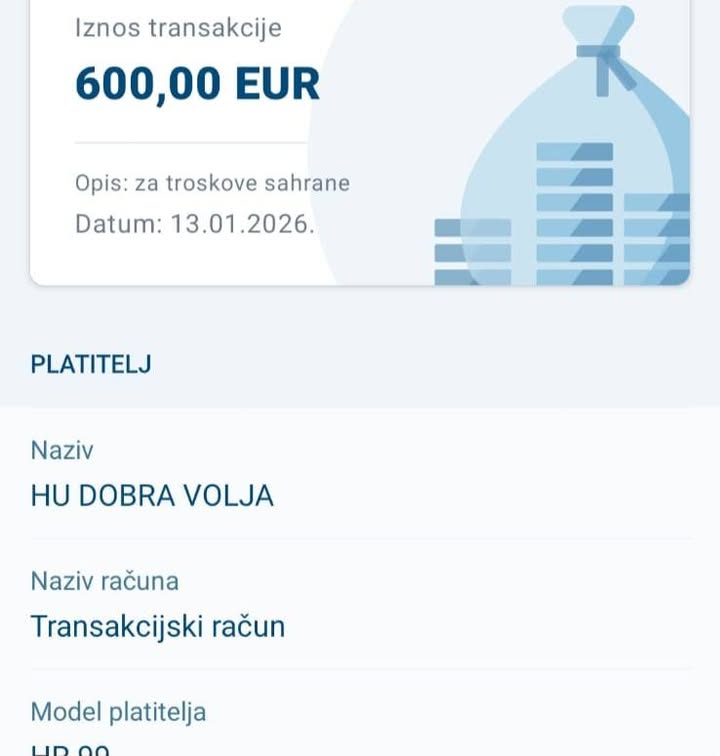 💌prošli mjesec napustio nas je čovjek koji je pomagao drugima cijeli život i onda kada je to ugrožavalo njegovo zdravlje i njegov život. Obitelji smo pomogli za 600,00 eura koliko su bili troškovi sahrane.