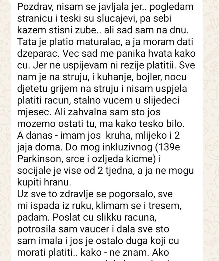 Druga_obitelj: mama čiju vam poruku prilažem dolje. Otac će platiti maturalac, ali neće plaćati alimentaciju. Prije par dana uplatili smo novce za dug struje i da mama kupi nešto hrane a naše cure će odnijeti i hrane iz našeg skladišta. Mami je zdravlje sve gore i gore.