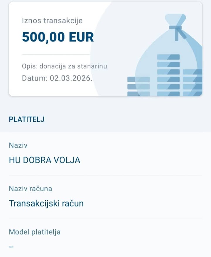 500,00 eura i ovaj mjesec uplatili smo gospodinu Nikoli koji je jako bolestan i nije u mogućnosti plaćati stanarinu bez naše pomoći, barem povremena pomoć mu je više nego potrebna.