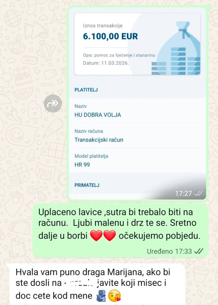 Prije samo nekoliko dana podijelili smo s vama priču o jednoj hrabroj mami koja vodi najtežu bitku – onu za život i za svoje dijete. Danas vam se javljamo s velikom zahvalnošću u srcu. Zahvaljujući vašoj dobroti, vašim donacijama, dijeljenjima i riječima podrške, za ovu hrabru mamu prikupljeno je 6.100 eura. ❤️